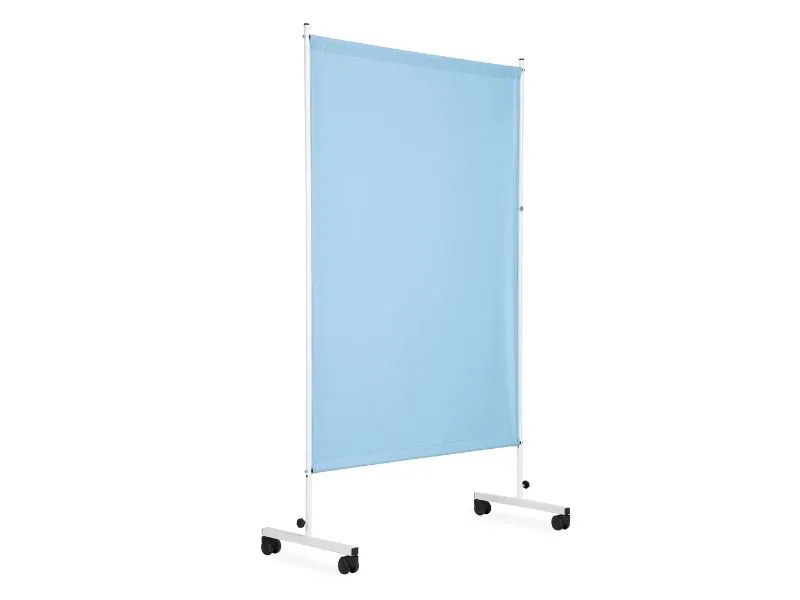 Konstrukcja oparta na stalowej ramie lakierowanej proszkowo zapewnia odporność na korozję i długą żywotność – 10-15 lat przy prawidłowej eksploatacji. Podstawa z kółkami 50 mm z centralnym systemem blokady to standard: po zablokowaniu pokrętła parawan staje się stabilny jak zabudowa stała, a po odblokowaniu można go przesunąć jedną ręką.